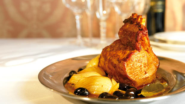 5 | Vor dem Servieren den Bratenjus mit Salz und Pfeffer würzen. Das Kotelett mit den Knochen in Scheiben schneiden (vom Metzger vorbereiten lassen) oder das Fleisch aus den Knochen lösen und in feine Scheiben schneiden. |