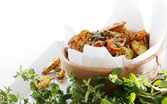 5 | Nach 30 Minuten Backzeit die Kartoffeln herausnehmen und wenden. Die Schnittflächen mit Salz sowie Pfeffer würzen und mit der Majoran- Kernen-Mischung bestreuen. Alles grosszügig mit Olivenöl beträufeln. Die Kartoffeln nochmals 10 Minuten backen. Vor dem Servieren mit dem beiseitegelegten Majoran bestreuen. |